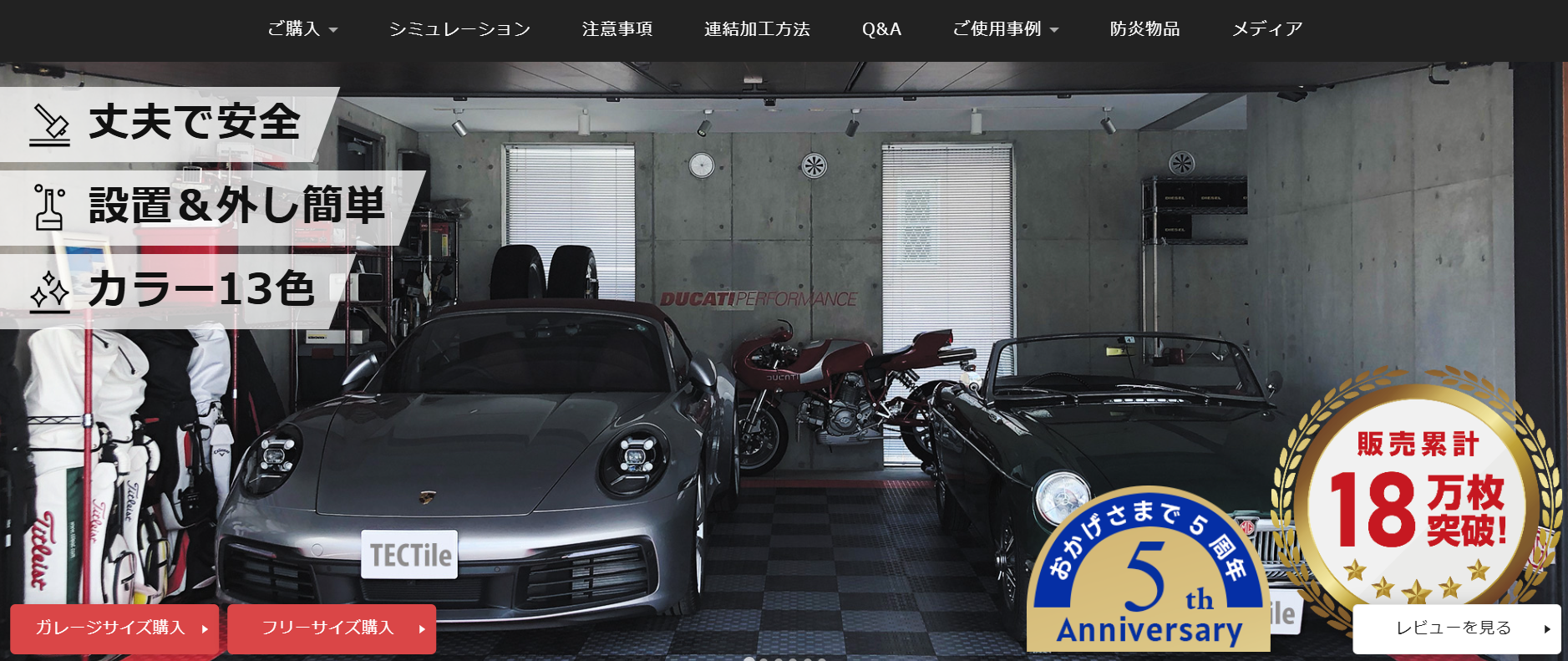 テックタイルは、株式会社オンリースタイルが販売するガレージ専用の樹脂製フロアタイルです。愛車を保管する空間をより快適に、美しく整えるために開発されており、個人ガレージから整備工場、ショールームまで幅広く採用されています。